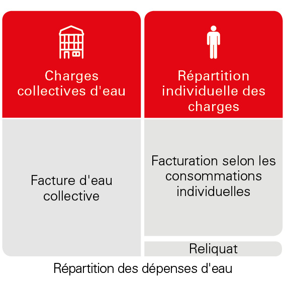 Votre gestionnaire répartit la facture générale d'eau entre les occupants selon notre relevé des consommations. Si de l'eau est utilisée pour les parties communes (reliquat), son coût est réparti entre les logements.