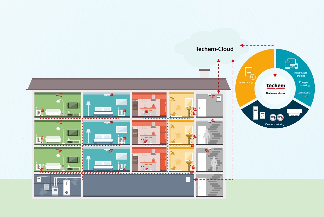 Smart System ist das Komplettpaket von Techem: Es erfasst und überträgt die Verbrauchsdaten der einzelnen Geräte in den verschiedenen Haushalten und leitet sie zentral an die Steuereinheit weiter, die sie speichert, kategorisiert und abrechnet.