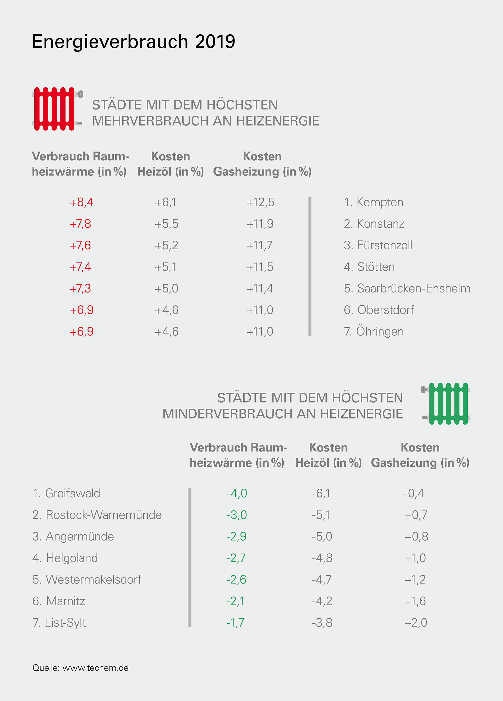 Während im Vorjahr vor allem im Norden Deutschlands Nachzahlungen für gestiegene Heizkosten zu leisten waren, können Mieter in diesen Regionen für 2019 sehr wahrscheinlich aufatmen: In Greifswald beispielsweise werden die Heizkosten für ölbeheizte Wohnungen voraussichtlich um 6,1 Prozent sinken; bei Gasheizungen beträgt der Rückgang immerhin 0,4 Prozent. Insbesondere in Cuxhaven, auf Helgoland und Norderney können sich Nutzer von Ölheizungen über verringerte Heizkosten freuen. Viele von ihnen mussten im Vorjahr eine mehr als 20-prozentige Kostensteigerung verkraften. Umgekehrt verhält es sich im Süden der Republik: Konstanz etwa gehörte 2018 noch zur Liga der Regionen mit dem größten Verbrauchsrückgang. 2019 hingegen steigen die Heizkosten für ölbeheizte Wohnhäuser dort temperaturbedingt um voraussichtlich 11,9 Prozent. Damit rangiert die Bodenseestadt nach Kempten im Allgäu 2019 an der Spitze der Regionen mit dem höchsten Mehrverbrauch.