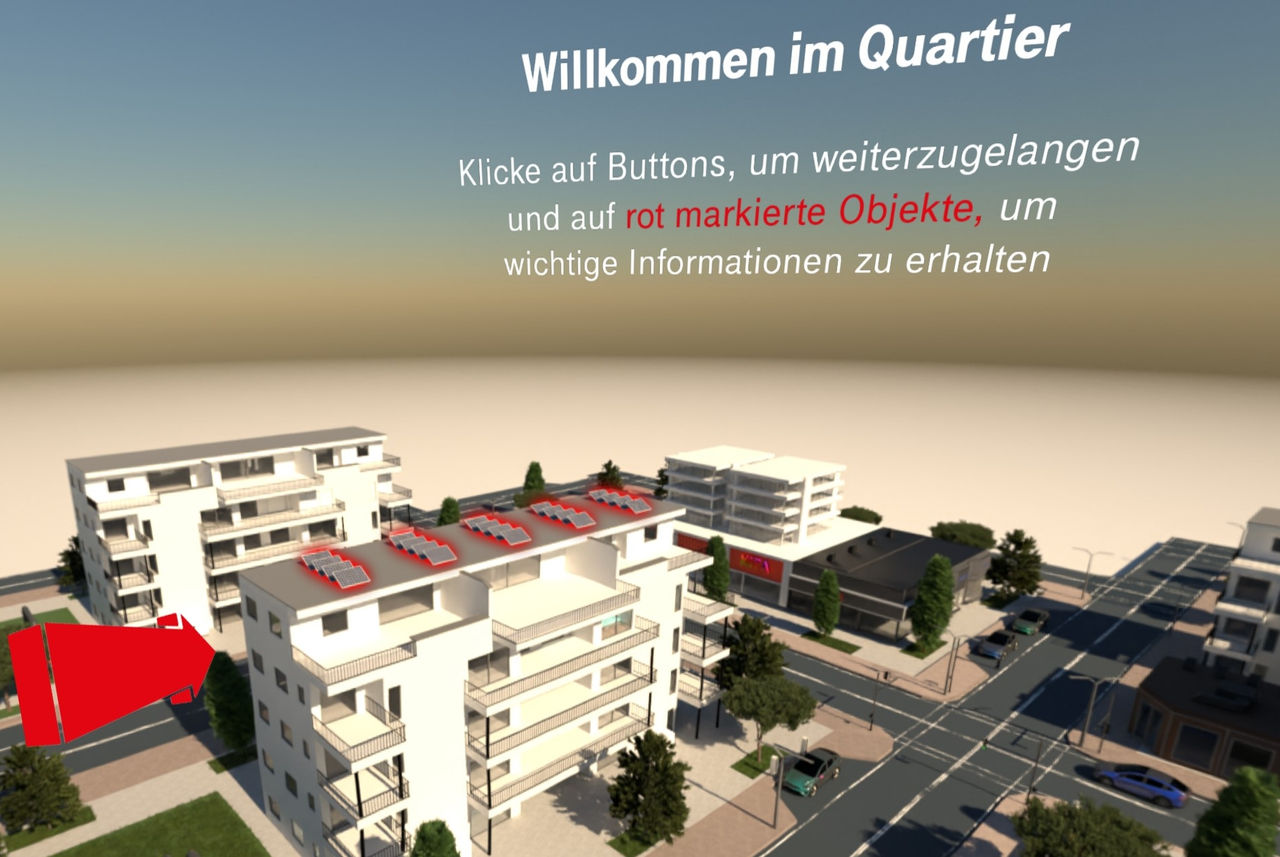 Durch Bewegen des Endgerätes oder durch Zoomen mit den Fingern lässt sich unser Quartier in Virtual Reality (VR) vergrößern oder verkleinern und Sie können sich auch in das Gebäude hineinbewegen. In unserem virtuellen Quartier öffnen sich durch Berührung der optischen Info-Punkten an den Lösungen/Geräten Pop-up Fenster mit Hintergrundinformationen. Ergänzend kommen Sie durch einen Klick auf das Icon auf die entsprechende Website, wo Sie weitere Informationen zu unseren Produkten und Lösungen finden. Unser virtuelles Quartier kann auf dem Smartphone & Tablet auch als Augmented Reality Anwendung genutzt werden, um das Quartier in die echte Welt zu projezieren.